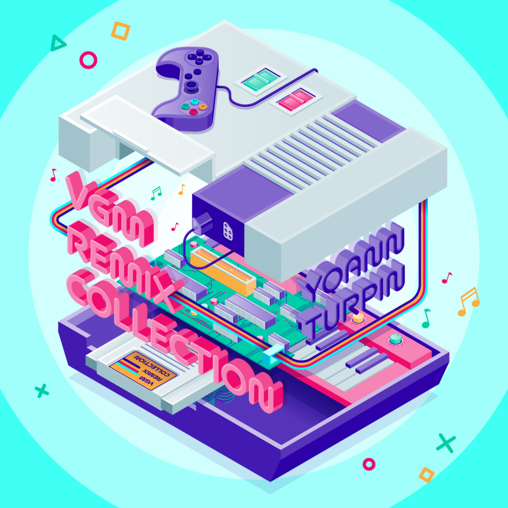 Yoann Turpin and I teamed up to create artwork for his VGM Remix Collection in late September 2020. This time, he provided the theme, video game music, and provided no style direction or imagery. Yoann wanted to see what I would come up with just having fun exploring the theme. I decided to create a fully isometric illustration of an imaginary video game console based on the design of other retro video game consoles. The console is split open to reveal a magical scene with the album name, Yoann’s name, ribbon cords, a motherboard, and, of course, a keyboard.